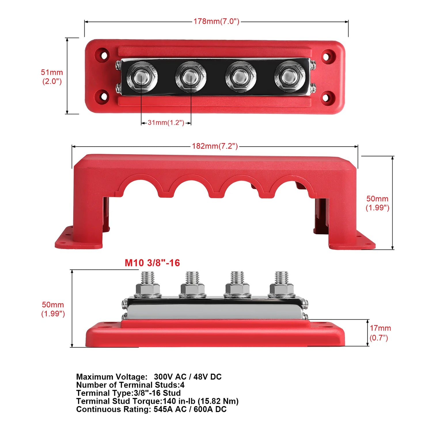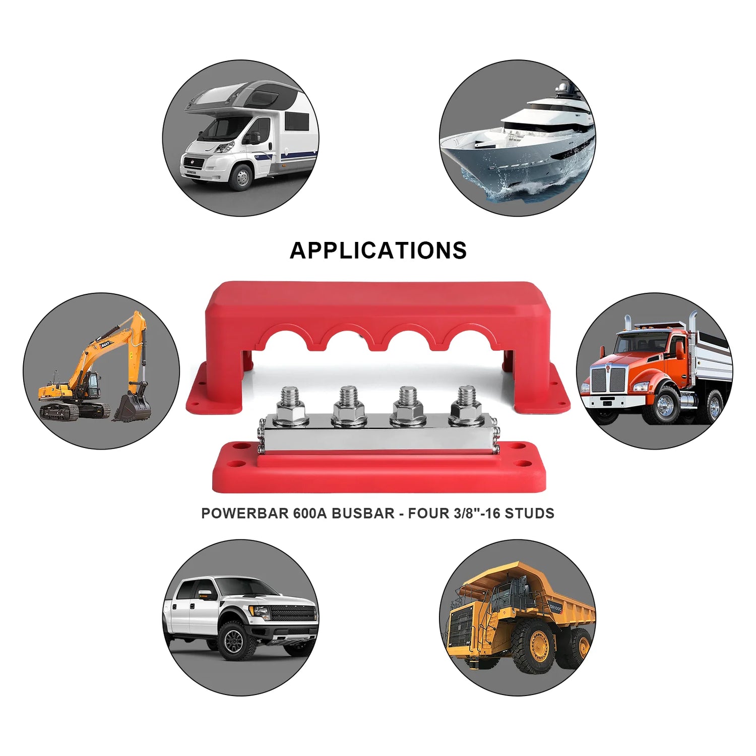 Streamline your vehicle’s power system with this 4 Post M10 Heavy Duty 24V 600 Amp Bus Bar Pair. Crafted with premium brass contact plates and a flame-retardant nylon base, it ensures superior current transfer and safety. Stainless steel studs offer versatile installation options, while the detachable cover protects connections from damage and corrosion. Perfect for automotive, RV, boat, and truck applications, this power distribution block keeps wiring organized and secure under demanding conditions.Â