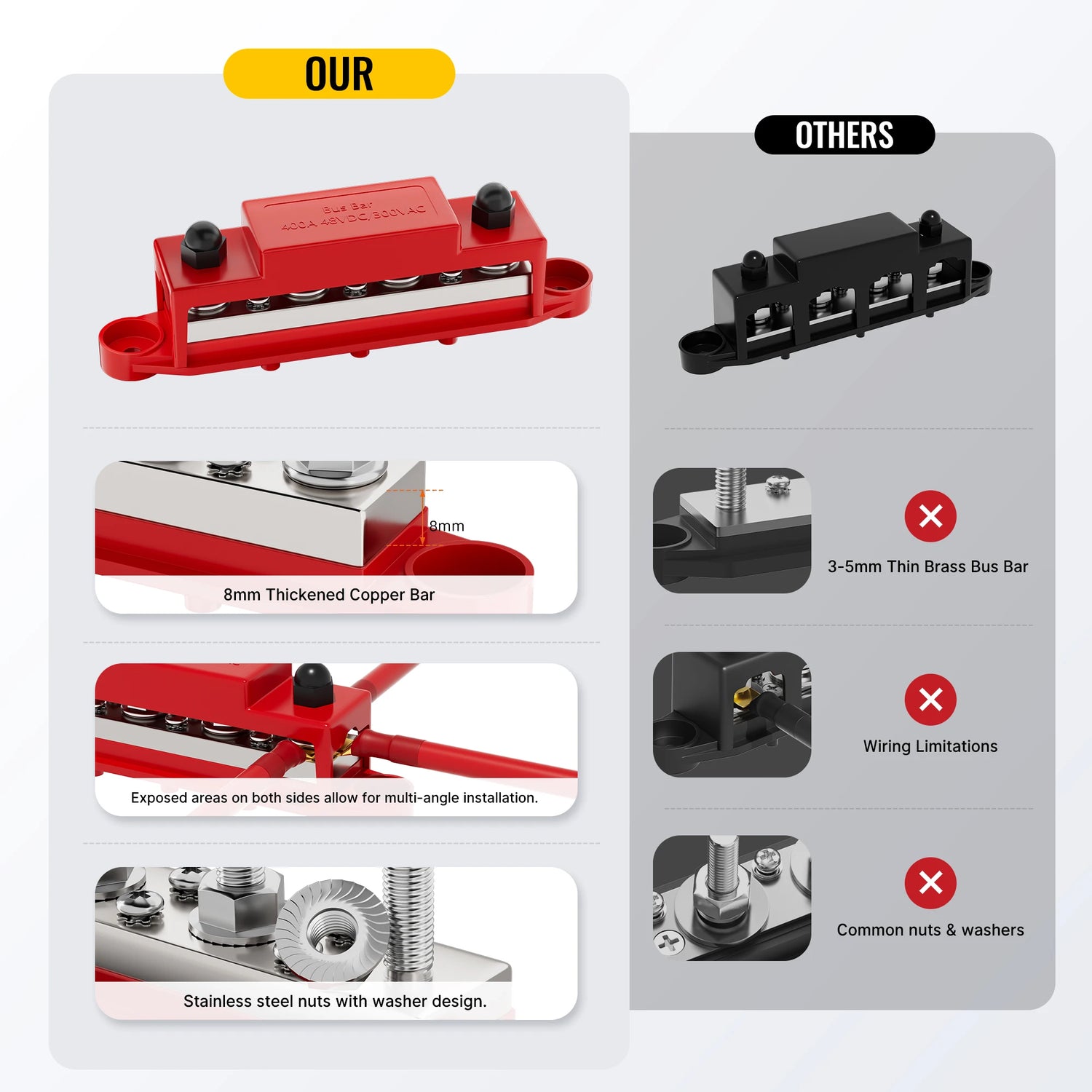 8mm Thickened Copper BarThe thickened copper bar can support up to 400A continuous current, and withstand max 300V AC or 48V DC voltage supply.