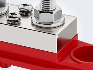 Nut Design with DasherThe nut and washer of this distribution block are designed as one, which will help to make the contact between the lugs and copper bar much closer.