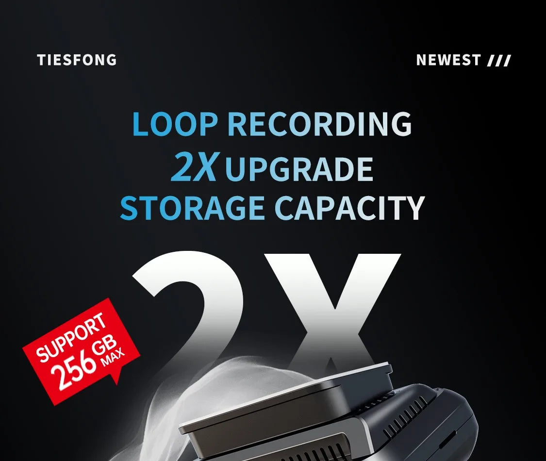 TIESFONG’s 4-channel recorder doubles loop recording efficiency with 2X storage capacity upgrades (64GB/128GB/256GB), extending recording time up to 26 hours on 256GB mode.