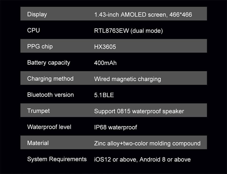 What sets this smartwatch apart is its interactive music feature, calendar activity tracker, steps tracker, distance tracker, and calorie tracker. It measures metrics such as heart rate, blood oxygen level, and sleep. The smartwatch is waterproof and has a built-in voice assistant. It features a touch screen with an AMOLED screen material and a resolution of 466 x 466.