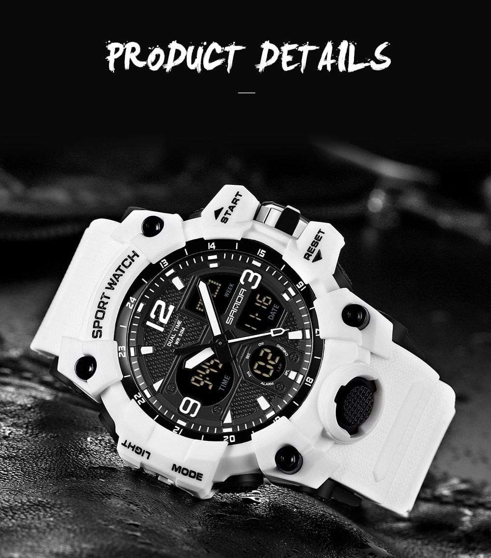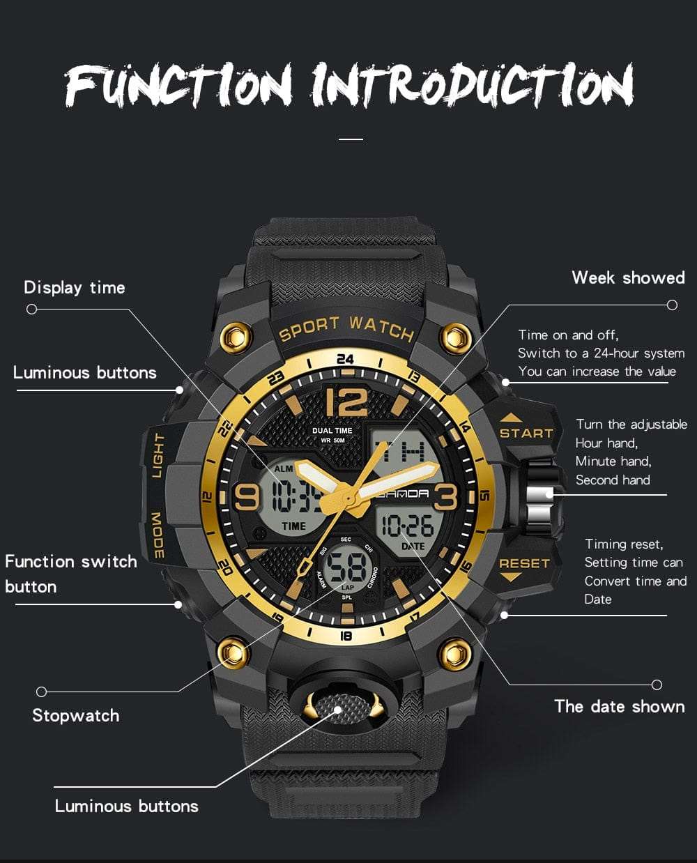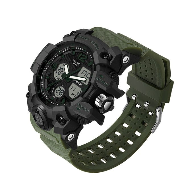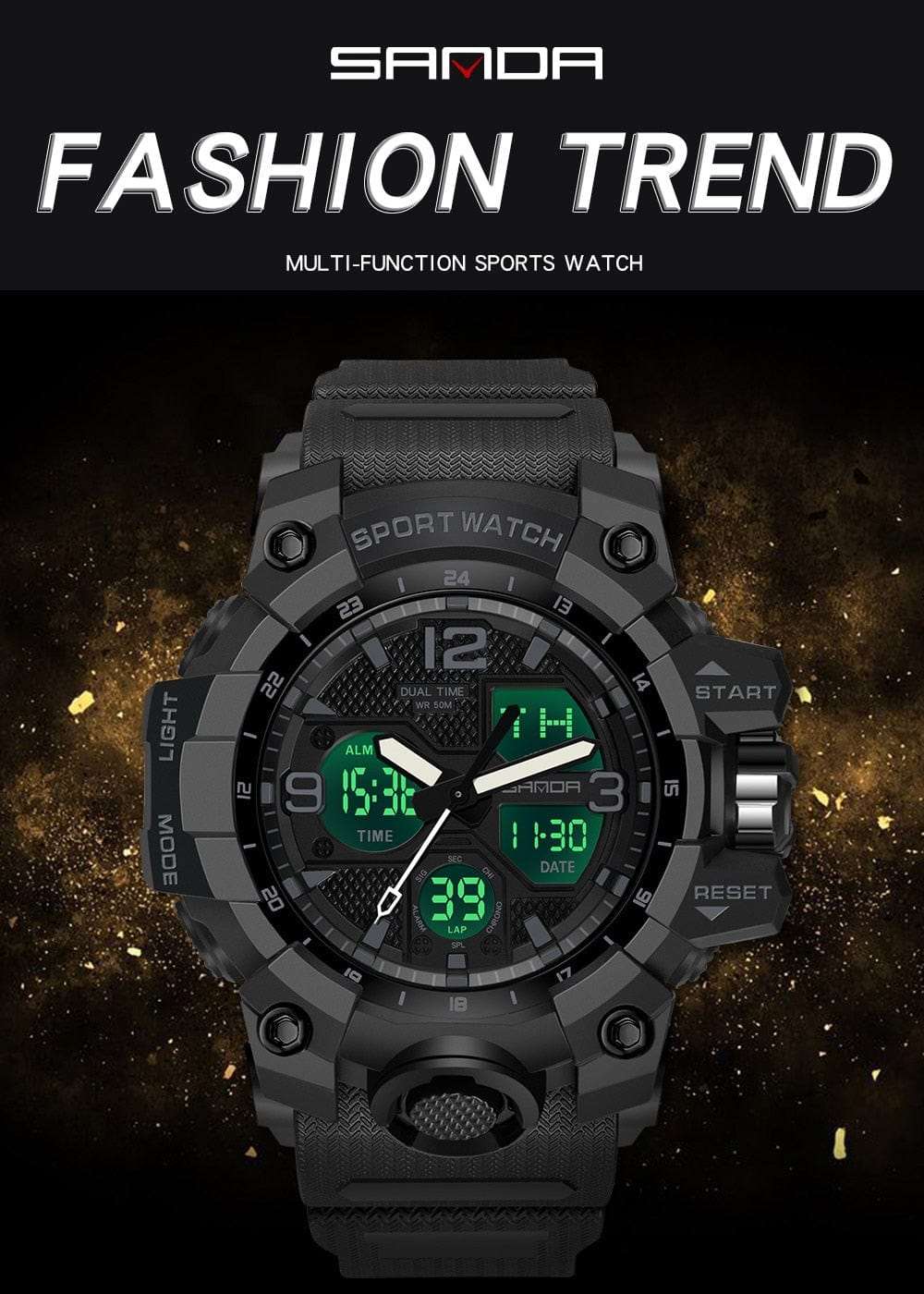 The 6030 Sports Military Quartz Watch is a unique timepiece that combines functionality and style. This top brand SANDA watch is designed for the active individual, featuring a dual display and a water resistance depth of 50 meters, making it perfect for swimming and diving.