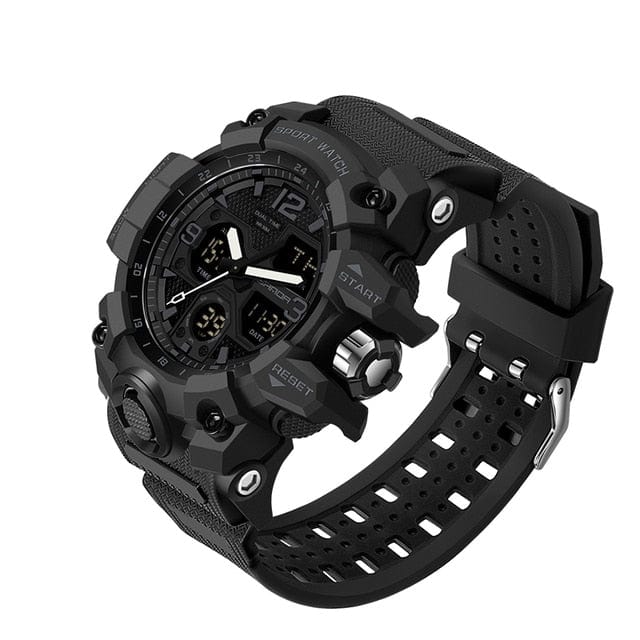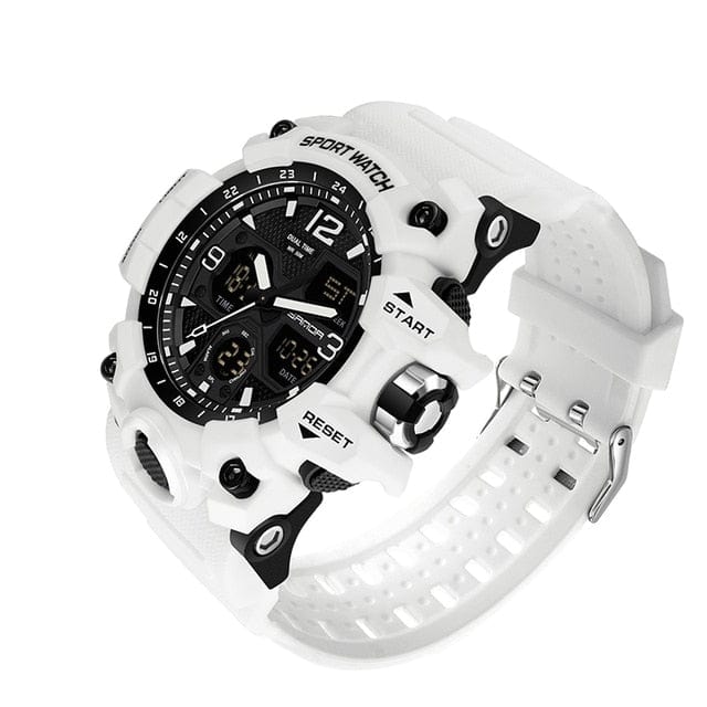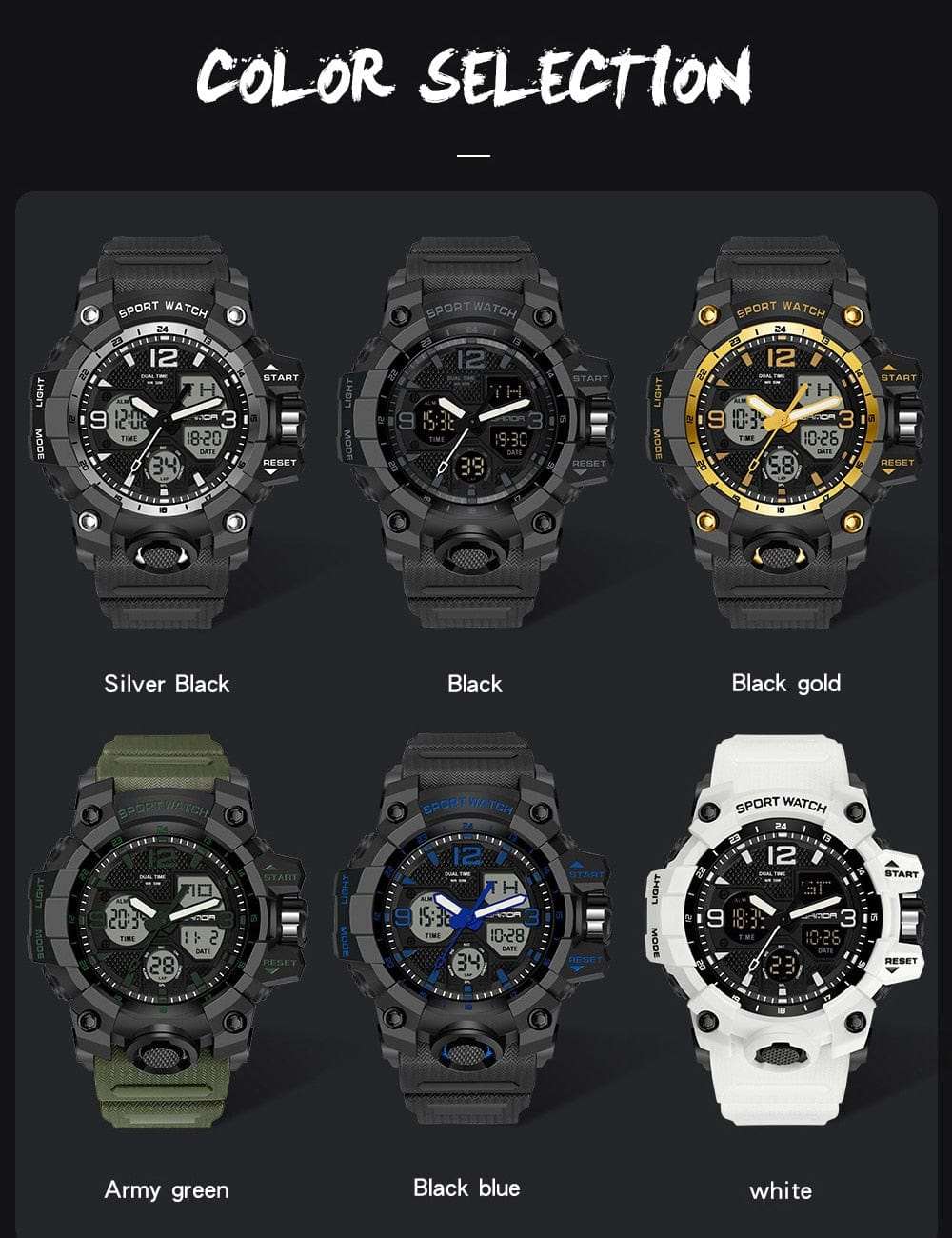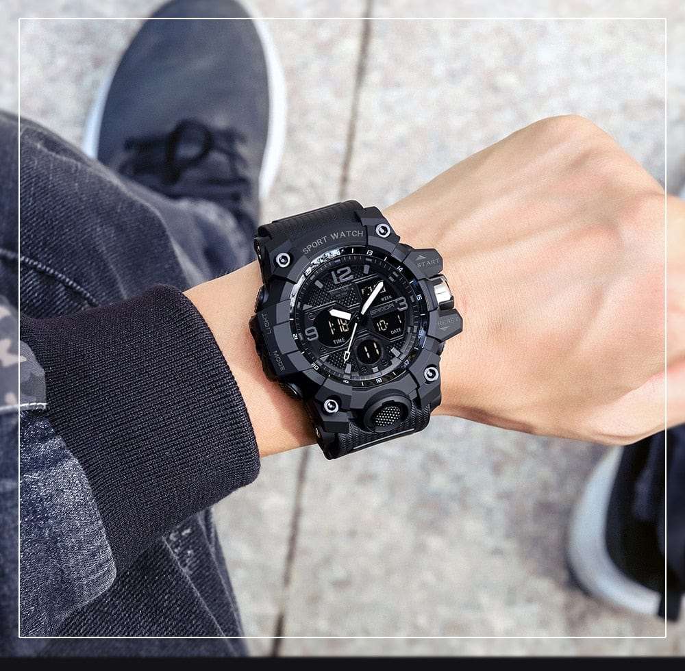 The 6030 Sports Military Quartz Watch is a unique timepiece that combines functionality and style. This top brand SANDA watch is designed for the active individual, featuring a dual display and a water resistance depth of 50 meters, making it perfect for swimming and diving.