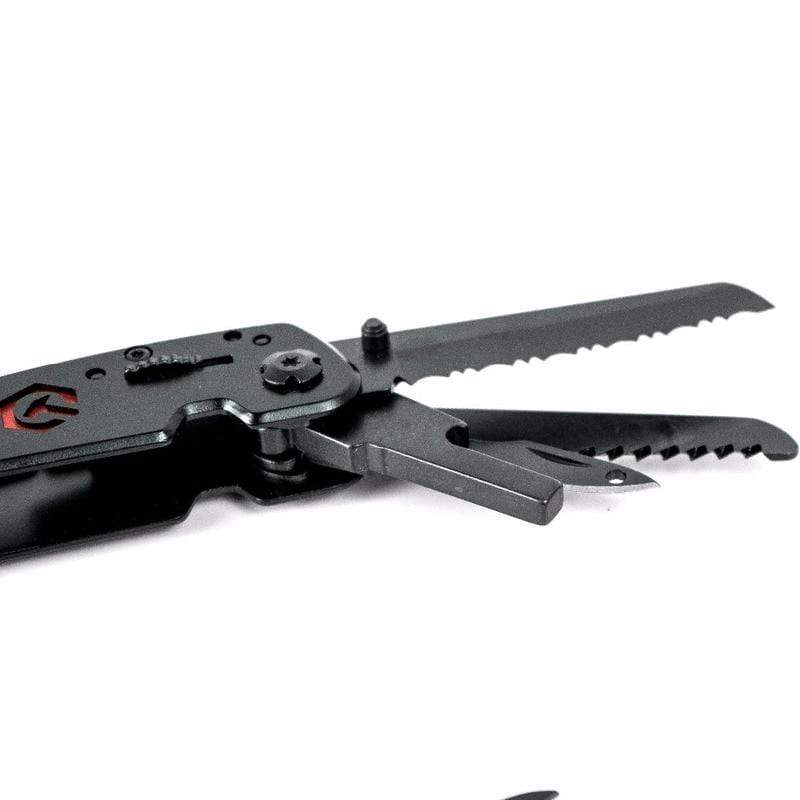 Eeverything you need at your fingertips. From a can/bottle opener, fine edge blade, serrated blade for cutting cord and wood, bit reamer, flat screwdriver to scissors, this tool has got you covered. Get yours today!