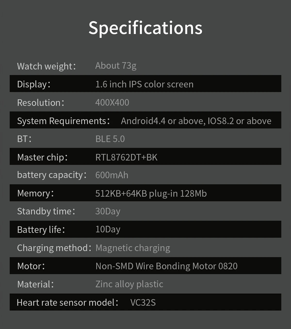 Function: Passometer, fitness tracker, sleep tracker, Message Reminder, Call Reminder, Answer Call, Dial Call, Push Message, Big Three Needles, 24 hour instruction, Chronograph, Alarm Clock, Small Second, World Time, Permanent Calendar, Power Reserve, week, Speed Measurement, Month, Heart Rate Tracker, Interactive Music, Calendar, Countdown