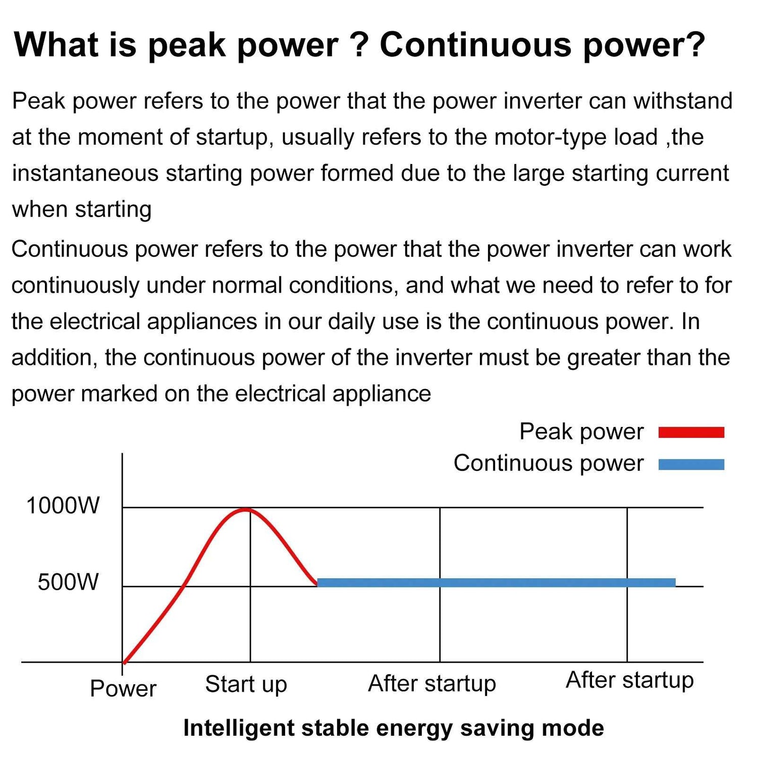 - Continuous Power & Daily use; Peak power only exists for a moment when the electrical appliance is started. The peak power of the inverter must be greater than the peak power required by the electrical appliance, otherwise it will not start. Simply put you just need to refer to the continuous power. Electrical appliances with power not exceeding 3000W can be used