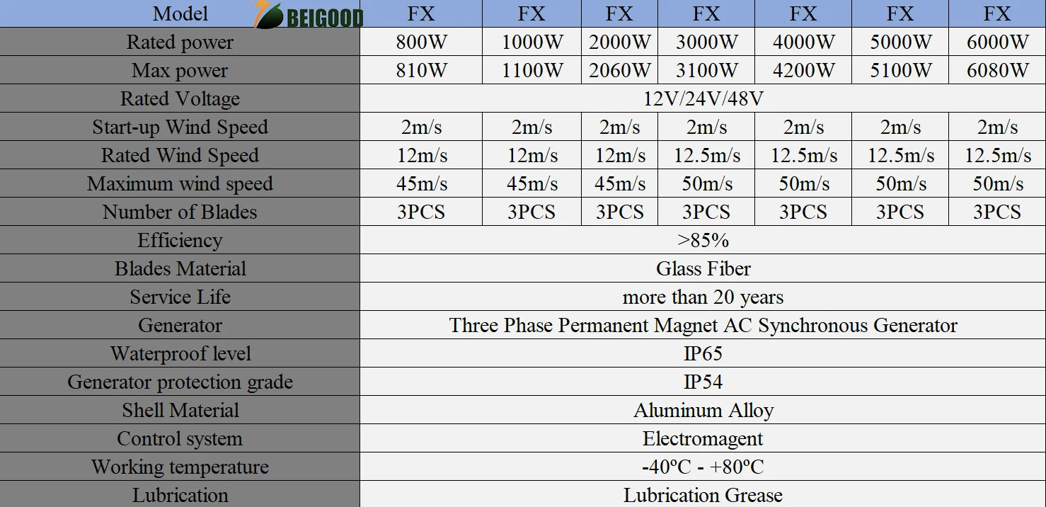 The BEIGOOD FX series vertical axis Maglev wind turbines feature a coreless, horizontal rotation maglev generator designed for high efficiency and low maintenance.Â