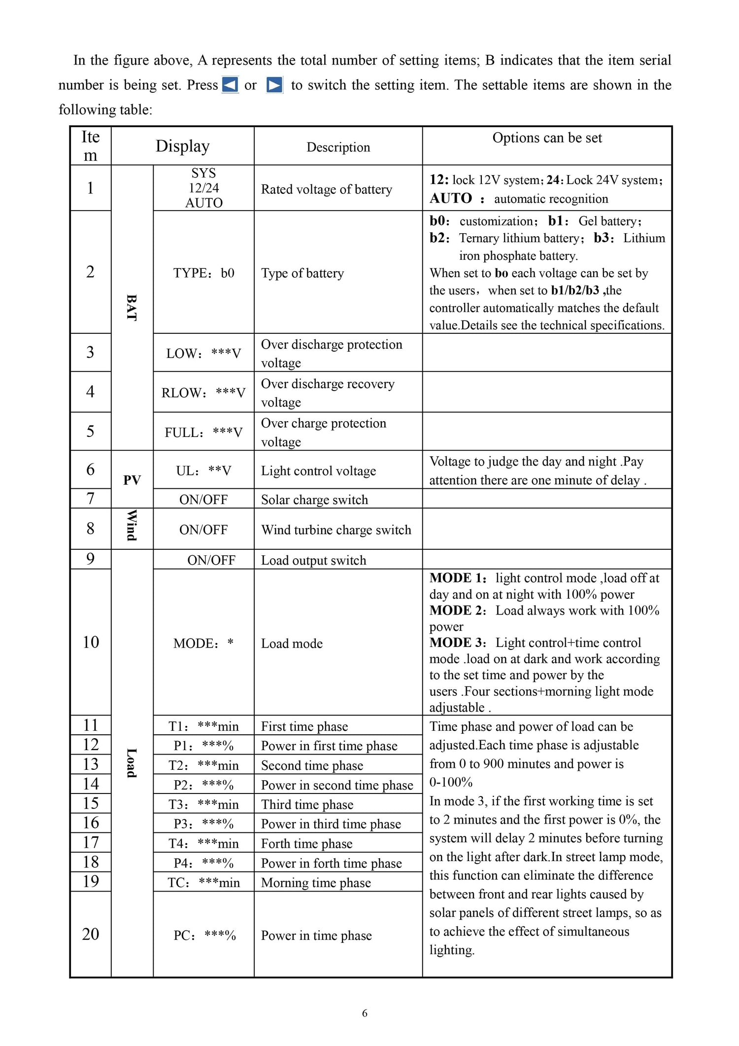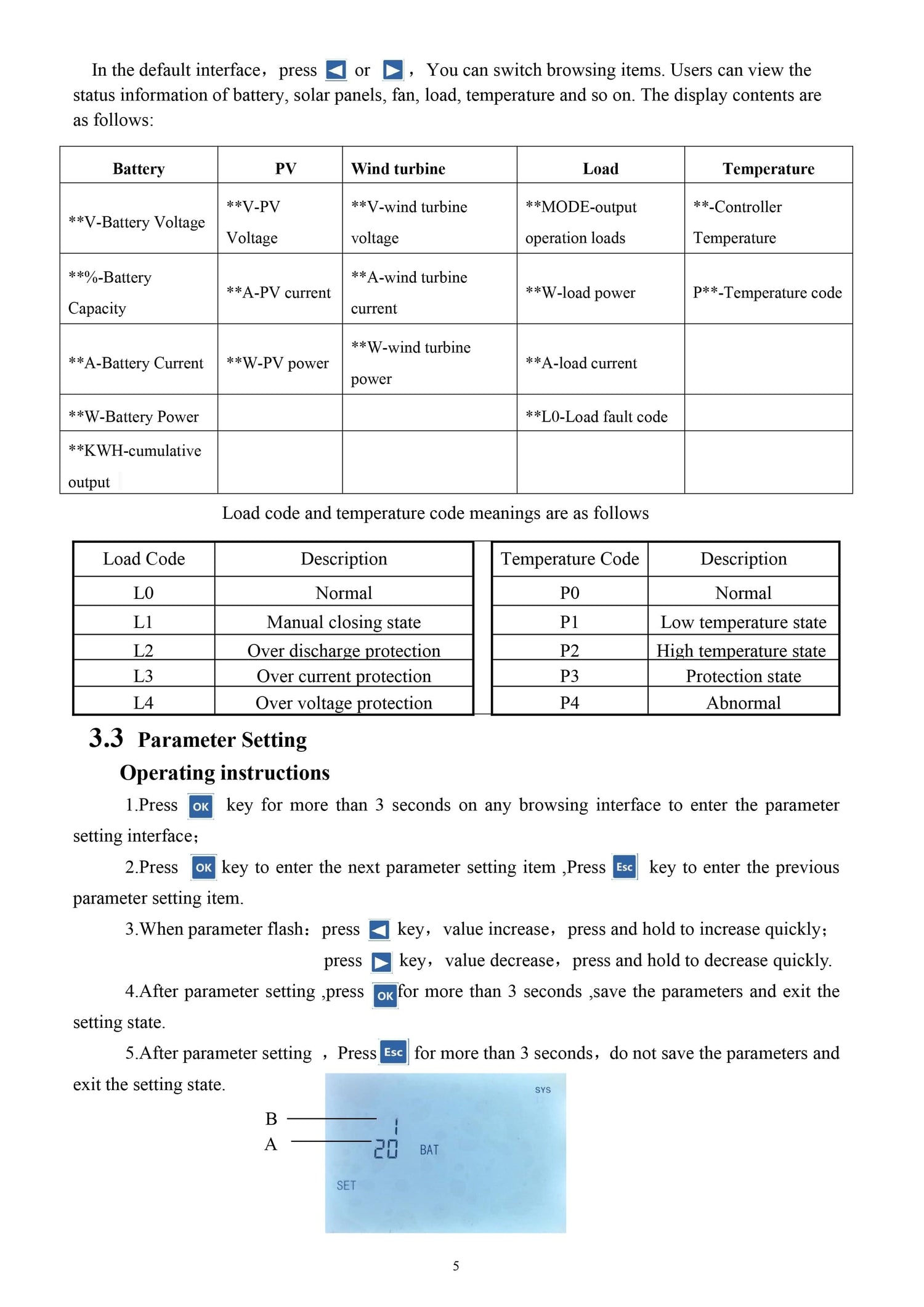 LCD display,Voltage, Percentage of battery power, Current, Working mode of load, etc |