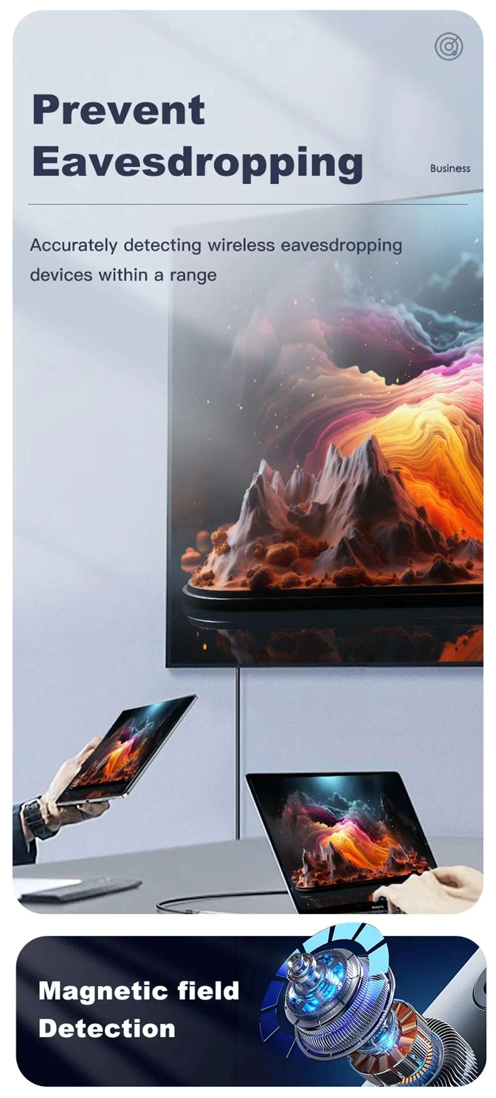 Professional Anti-spy Detector with advanced AI chips, it's easy and quick to detect wireless hidden cameras, VHF/UHF transmitters, GSM/3G/4G bugs, GSM/3G/4G GPS tracker, wireless signal source and stronger magnetic field signal.