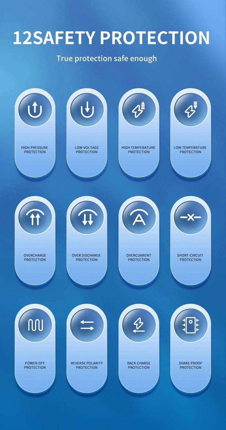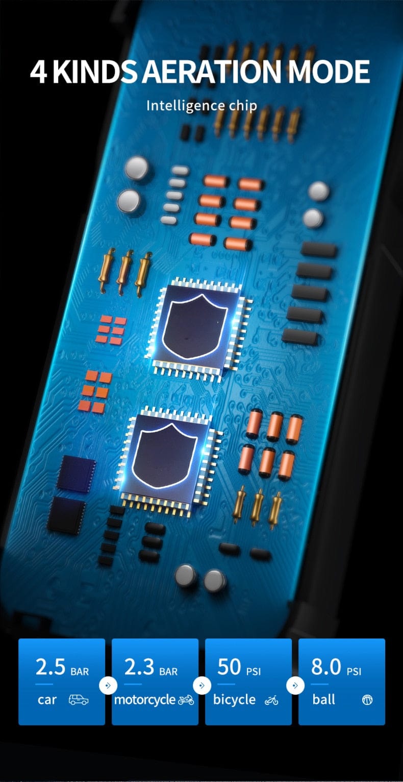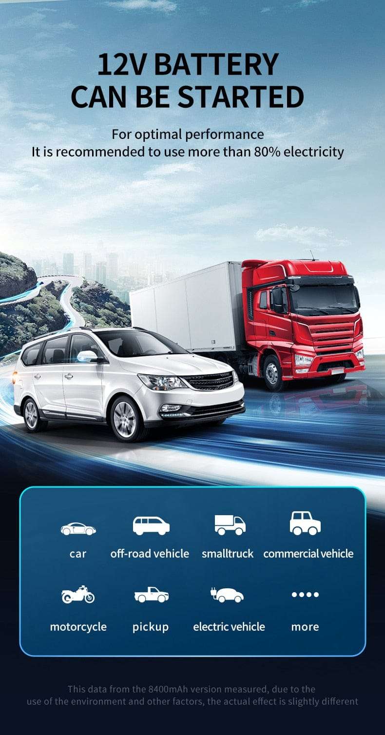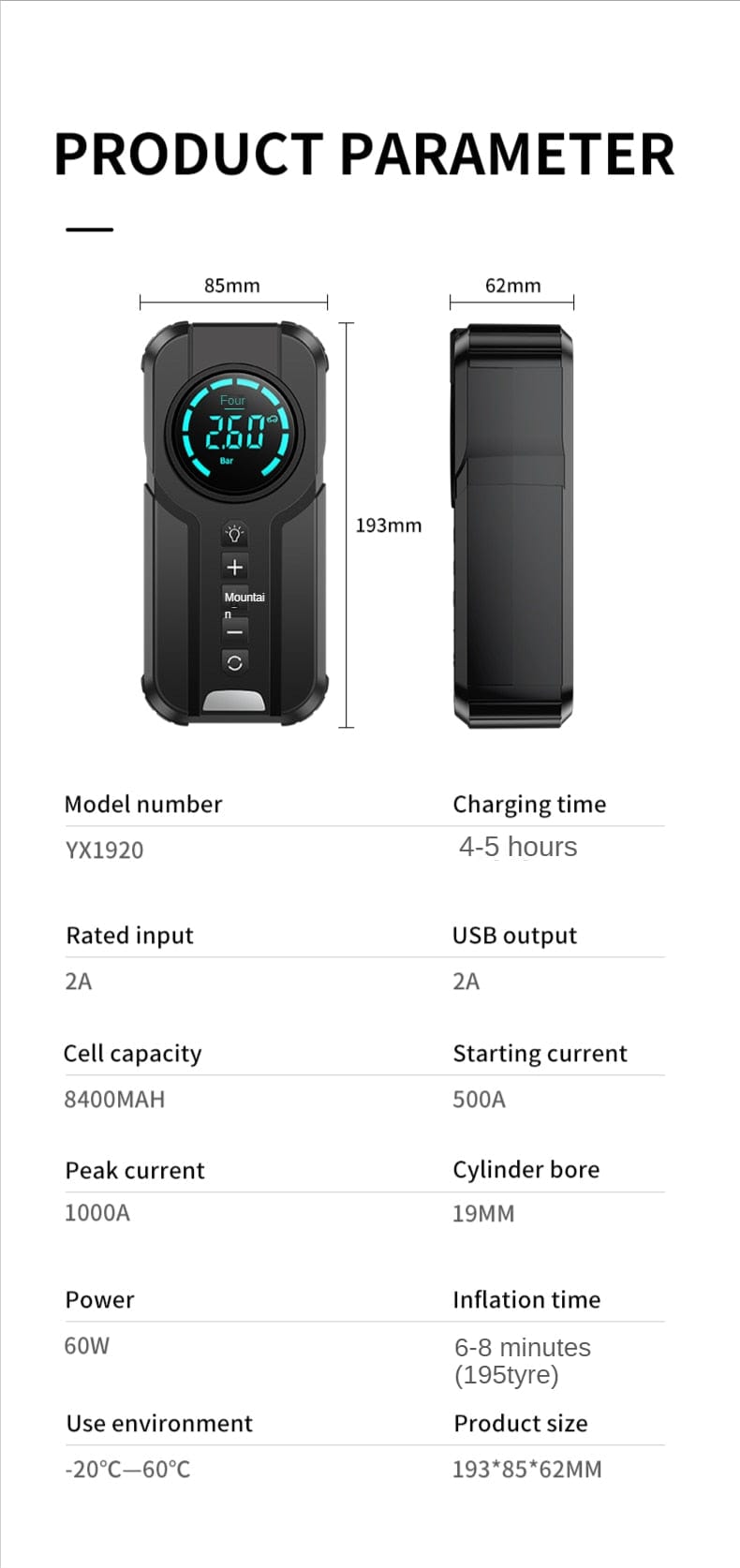 Multi-function tire inflator with two-way fast charging, a peak current of 1000 A, and a battery capacity of 8000-10000 mAh. It has 4 built-in batteries and features USB lighting, CE, FCC, and UL certification. Lightweight and reliable, this air compressor ensures maximum convenience and accuracy.