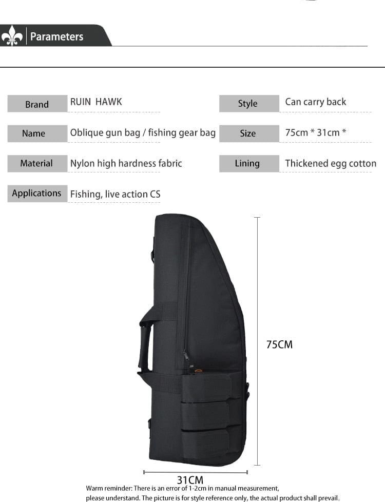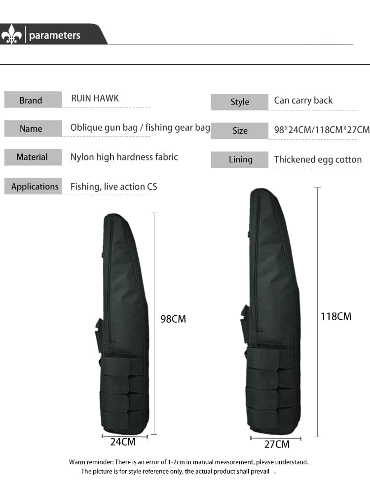 RUIN HAWK's Rifle Safety & Protection & Carry Case 3 sizes is the perfect choice for hunters, tactical and military personnel. This bag is made of high quality 1000D nylon and comes in four colors: black, green, tan, CP and ACU. It is available in three sizes: 70CM, 98CM and 118CM, with adjustable closure type zipper.