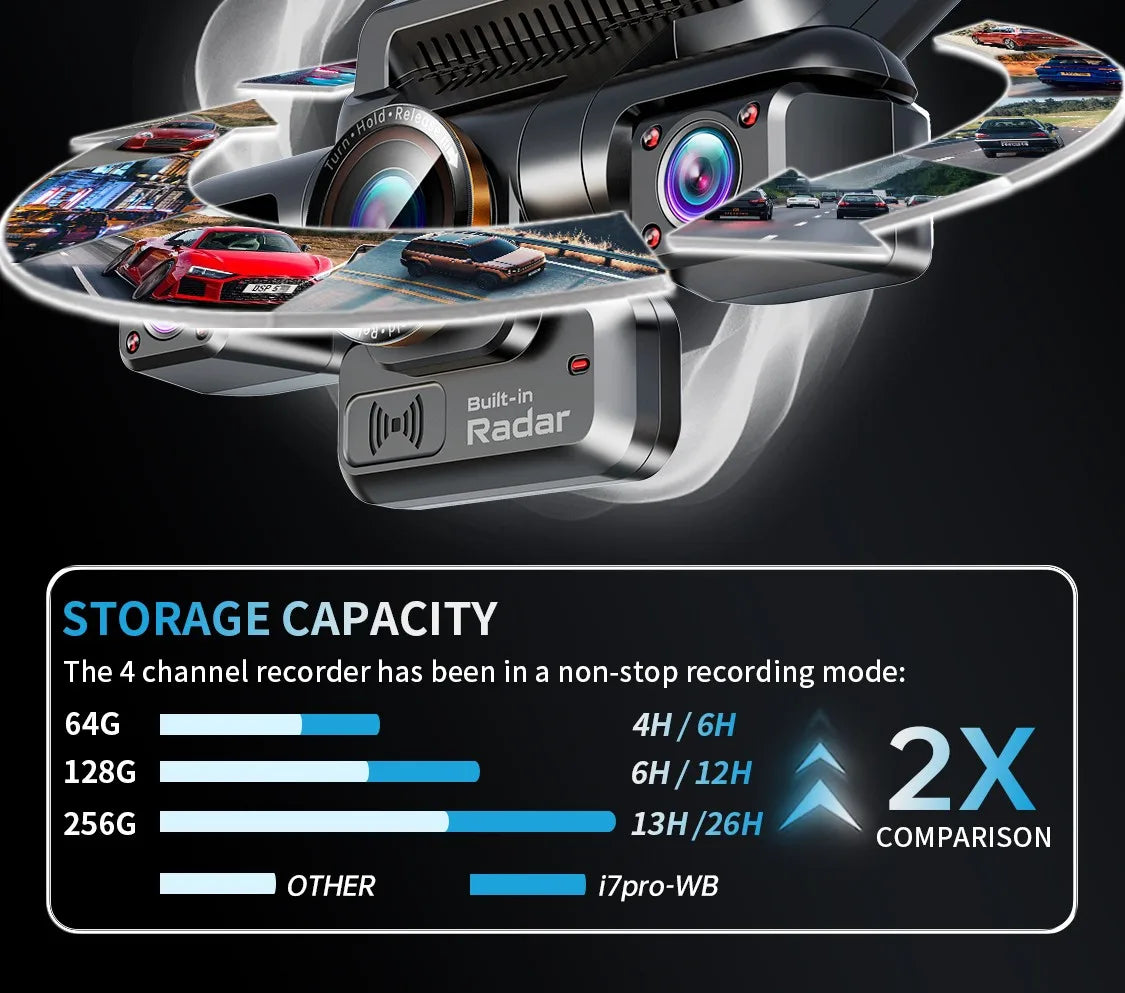 TIESFONG’s 4-channel recorder doubles loop recording efficiency with 2X storage capacity upgrades (64GB/128GB/256GB), extending recording time up to 26 hours on 256GB mode.