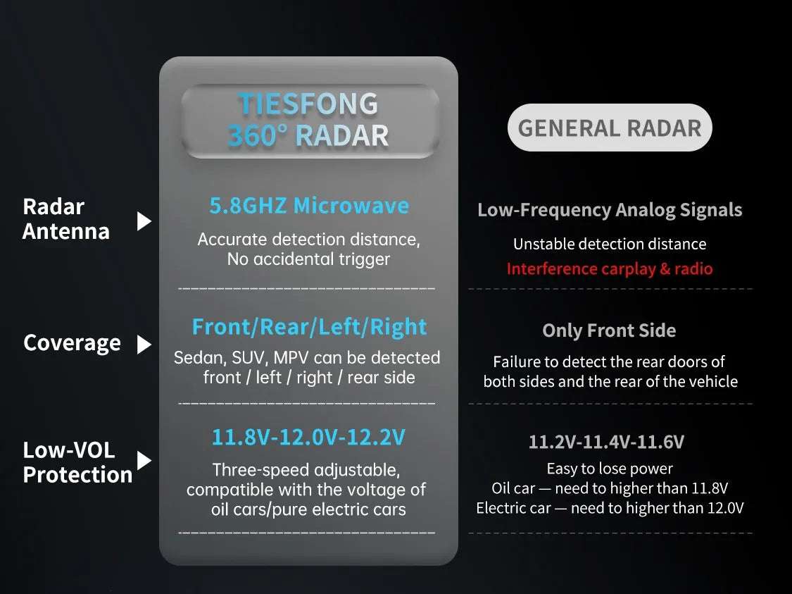 TIESFONG's Sentry Radar with 5.8GHz microwave technology for precise detection (no accidental triggers) and 360° full-coverage (front/rear/left/right) across sedan, SUV, and MPV models.